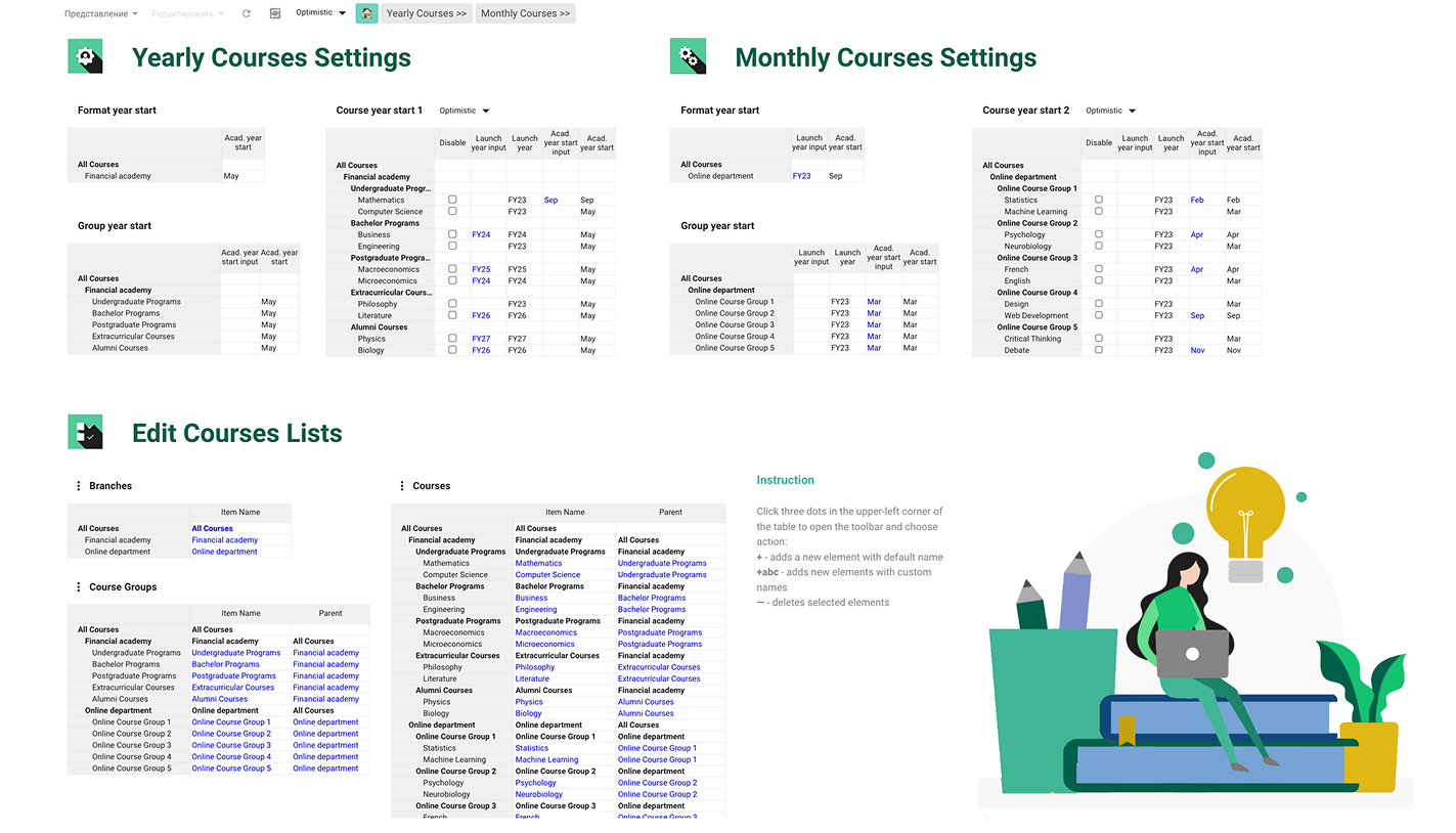 Создание структуры офлайн и онлайн курсов с детализацией по предметам